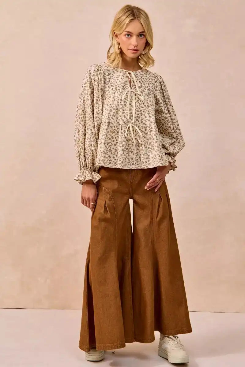 BiBi Floral Printed Peplum Blouse with Shirring and Tied