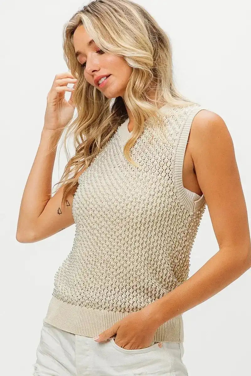 BiBi Knitted Beaded Pearl V Neck Sleveless Top - Sleekdenim.com