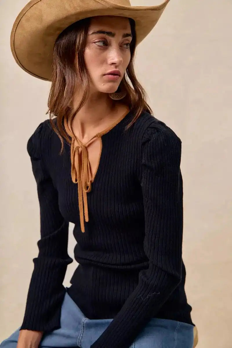 BiBi Ribbed Contrast Front Tied Top with Shrried