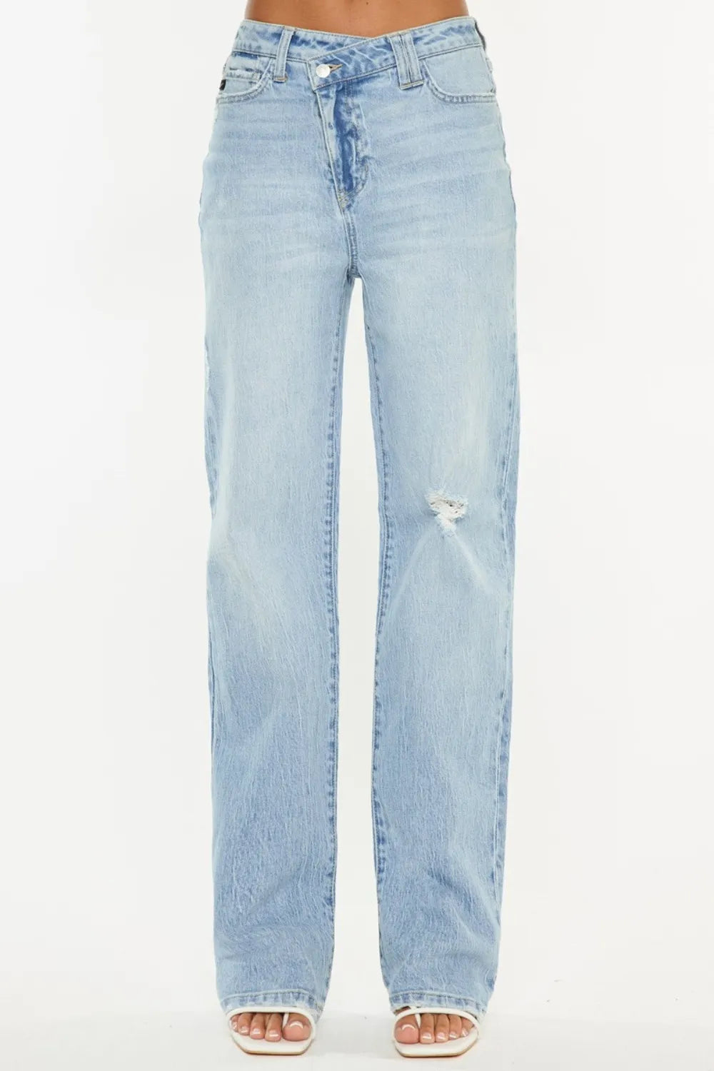 The distressed high-rise straight-leg jeans are modern. Wear it with a simple top or a stylish coat for a trendy...