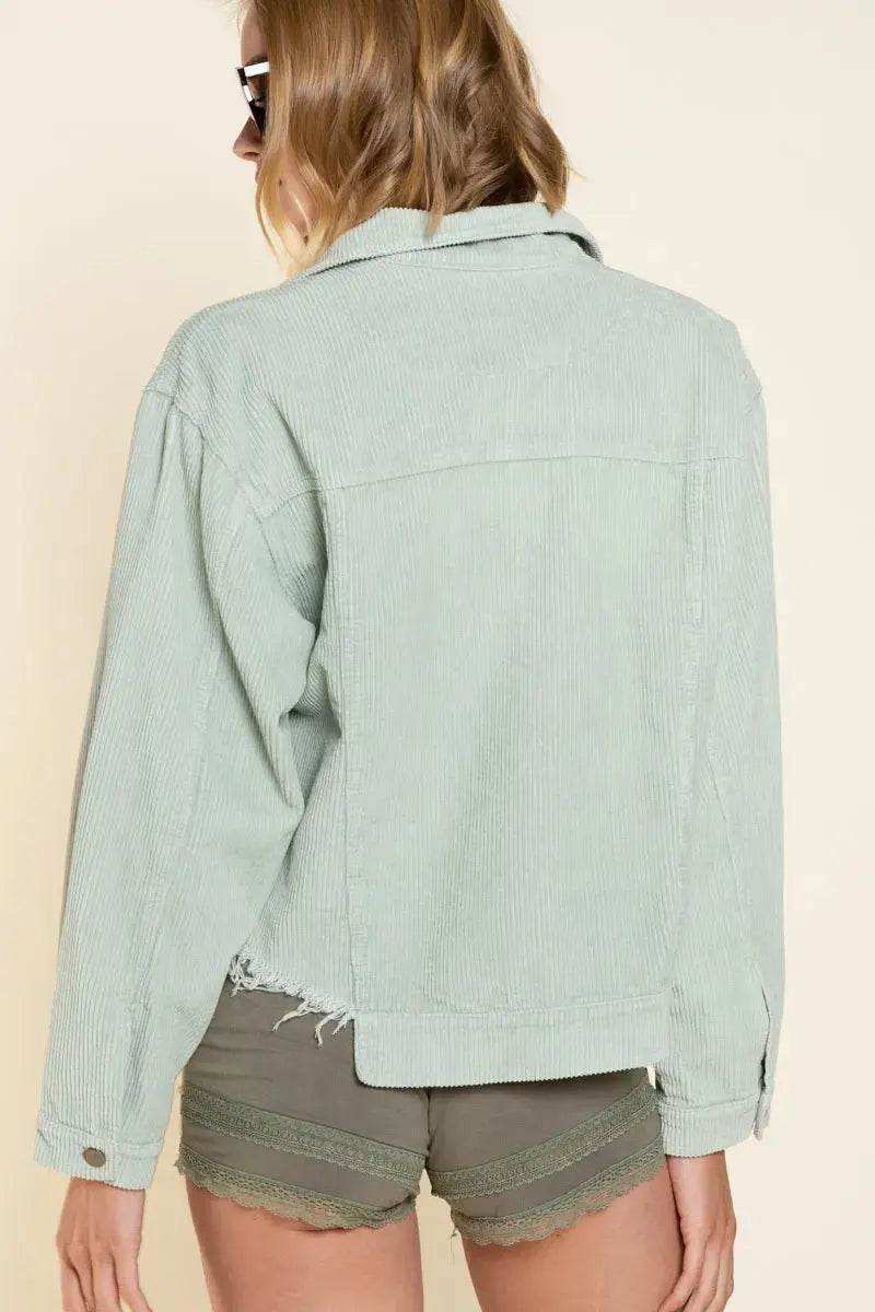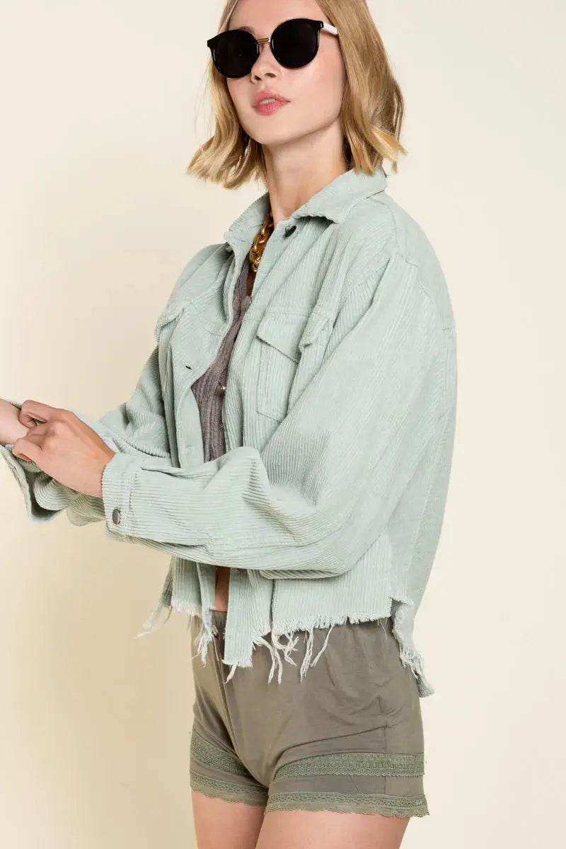 This fashion cropped denim jacket features a beautiful sage green wash that adds a fresh twist to the classic denim...