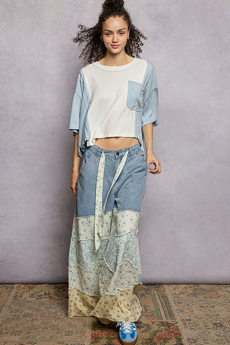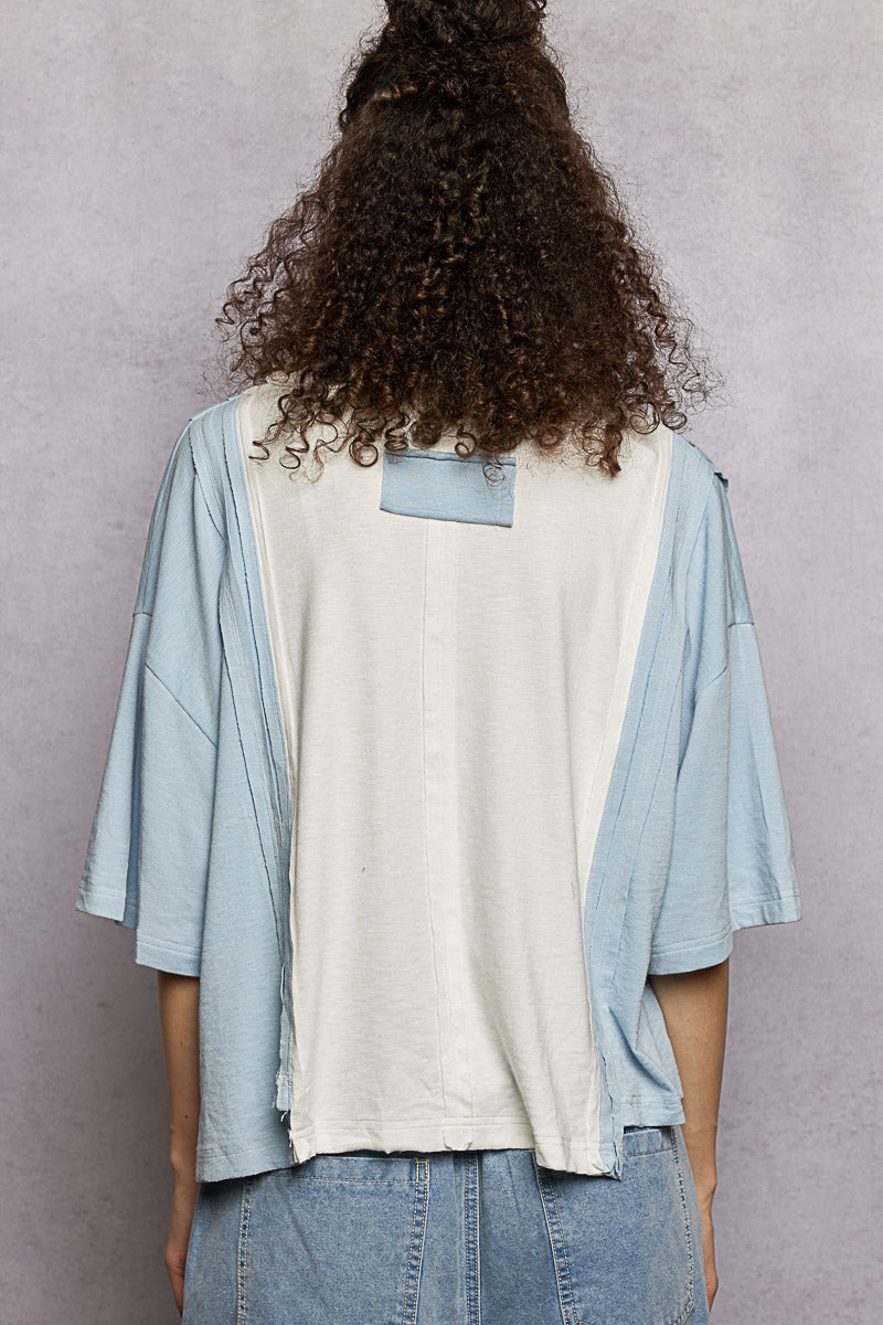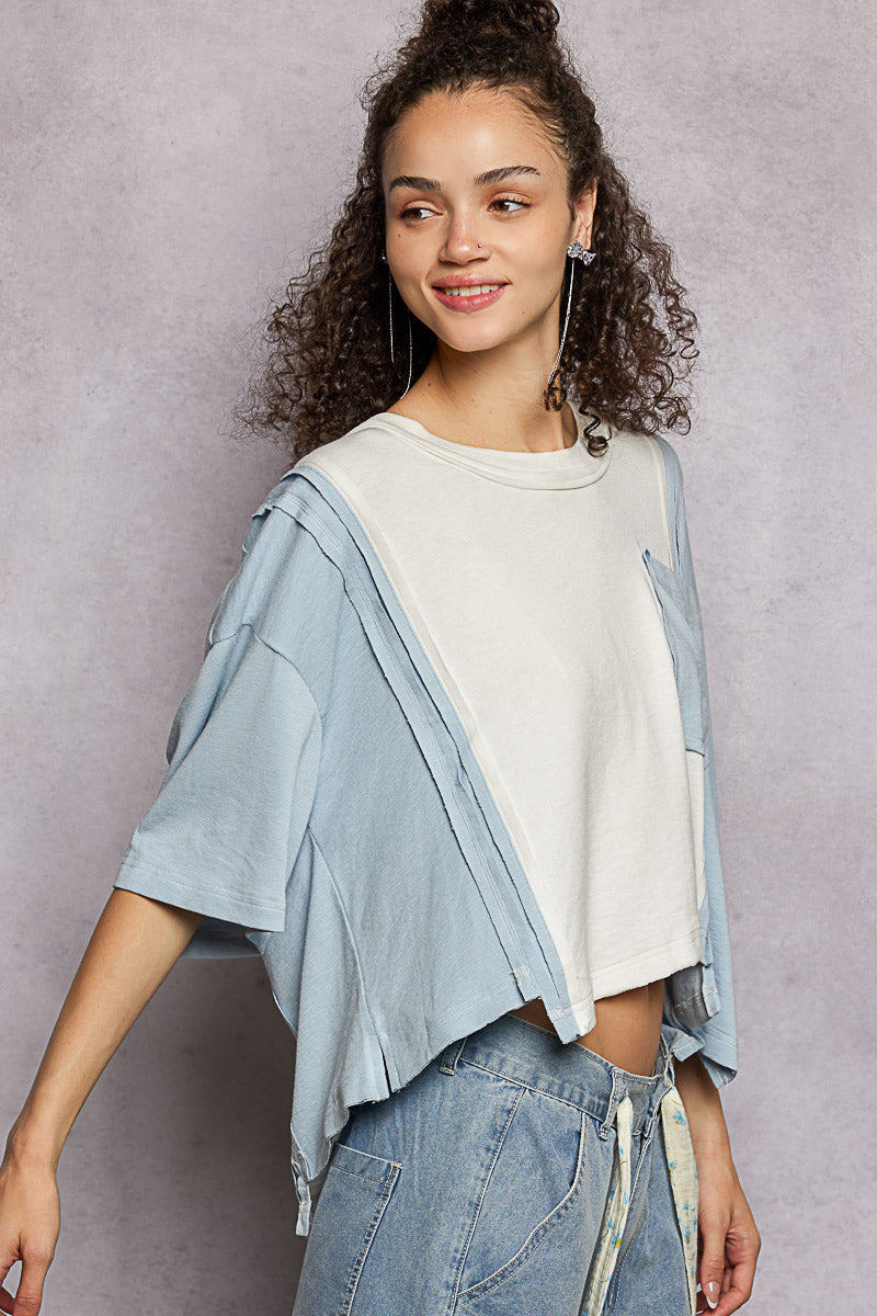 This round neck short sleeve shirt features a roomy, comfortable fit crafted from our signature ultra-soft, lightweight jersey fabric. It showcases modern deconstructed seams and bold color-blocked panels for a contemporary, edgy look. Designed with an asymmetrical hemline and a functional chest patch pocket, it blends unique detailing with everyday practicality. The soft jersey material ensures all-day comfort, making this shirt a stylish and versatile staple for casual wear.