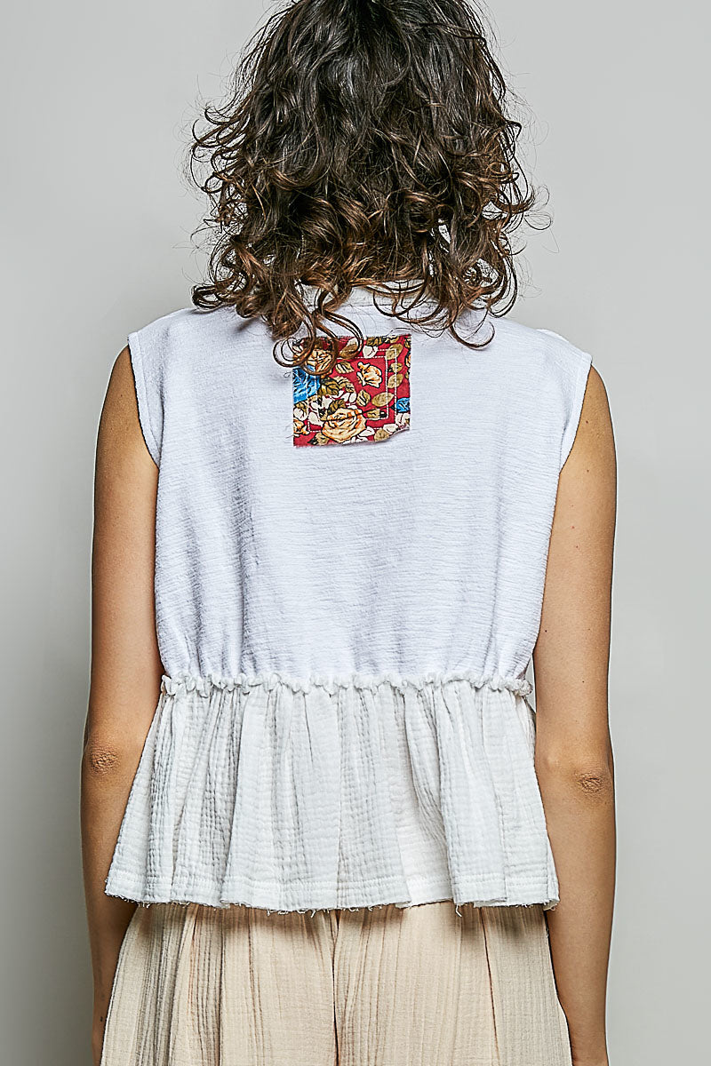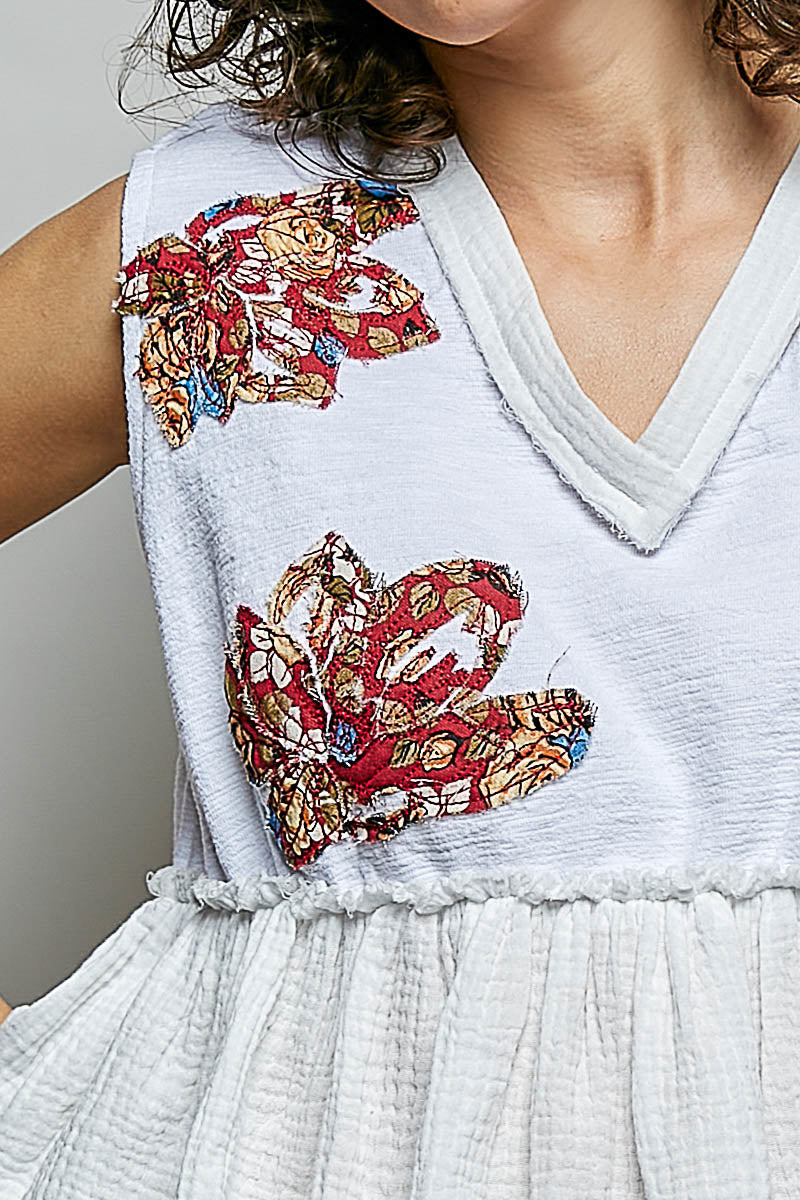 Textured knit sleeveless top designed with a relaxed, bohemian-inspired silhouette and artisanal detailing. Features a flattering V-neckline, delicate floral patch accents, raw edge detail, and a gently gathered peplum hem for added texture and movement. A standout statement top perfect for casual wear or effortless layering.