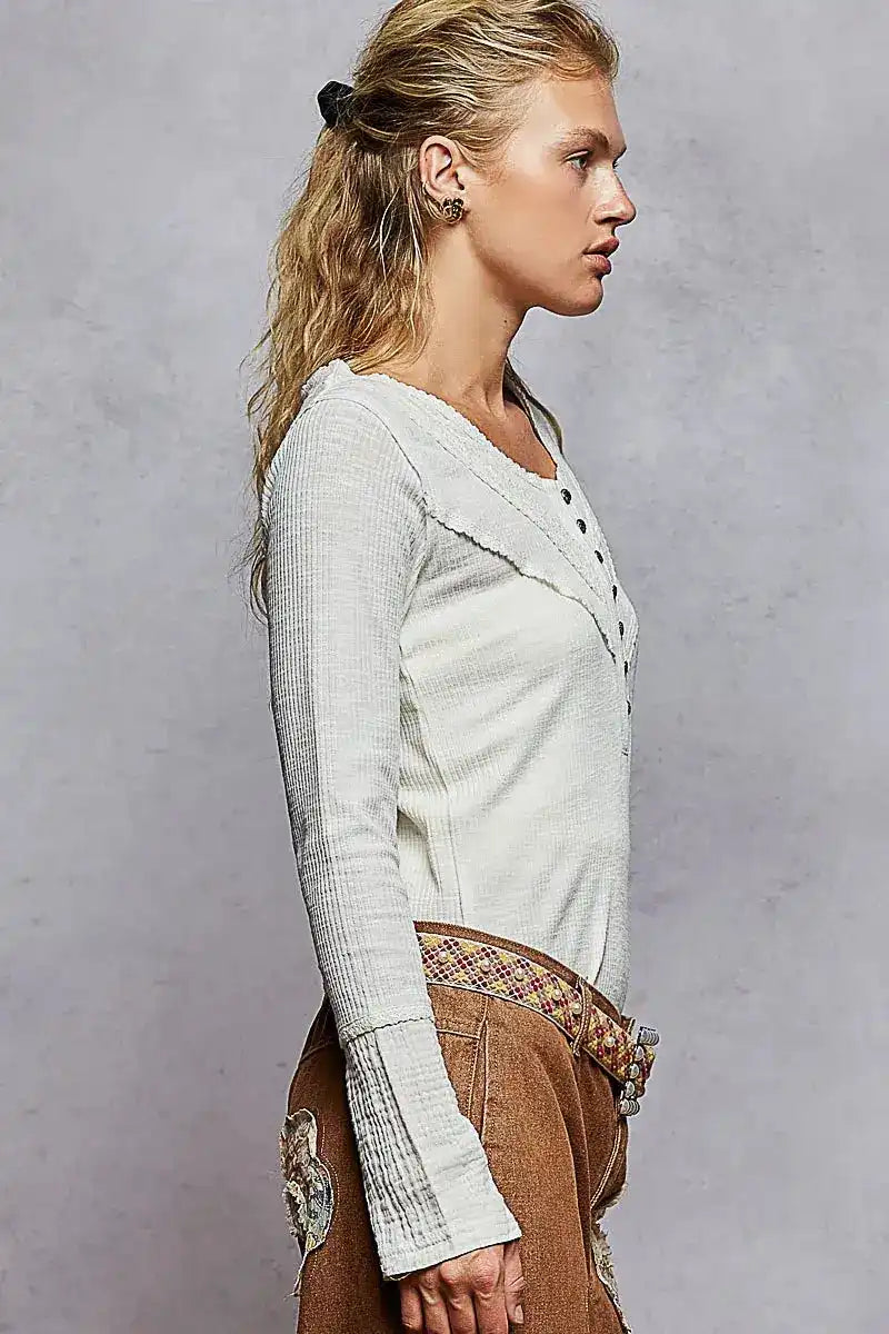 Stay stylish with this Ribbed Half Button Lace Detail Knit Top. The ribbed knit fabric provides a flattering fit while...