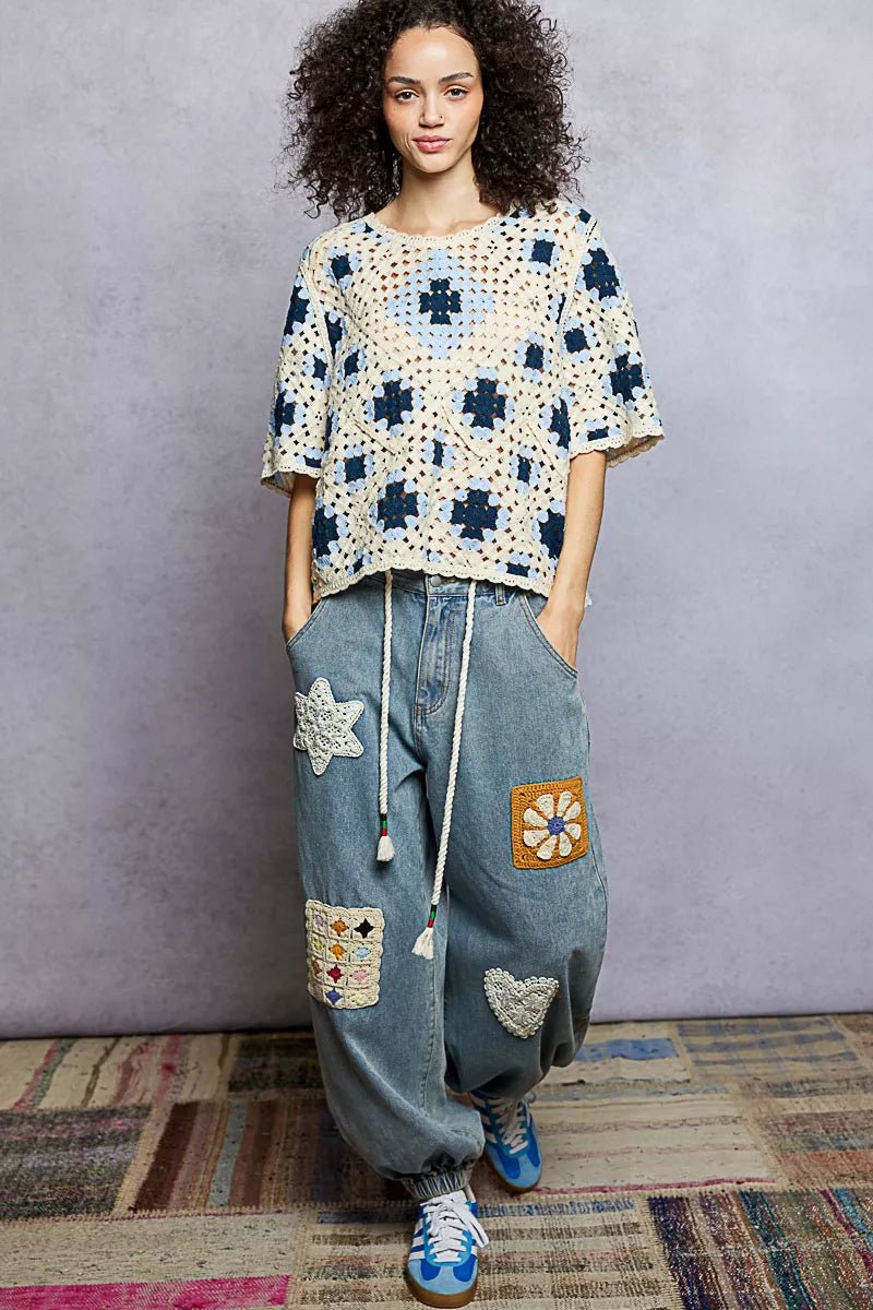 Achieve a boho-chic look with this round neck short sleeve roomy fit top featuring crochet detailing with varied color patterns...