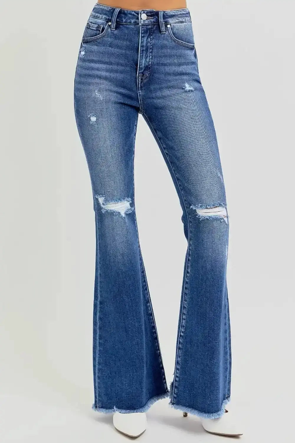 RISEN Full Size High Rise Distressed Raw Hem Flare Jeans