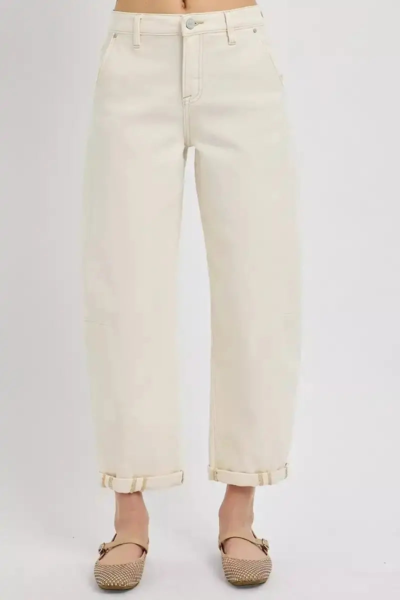 RISEN High Rise Relaxed Barrel Cuffed Jeans These stylish wide leg cropped jeans feature cream beige tone. Crafted from premium...