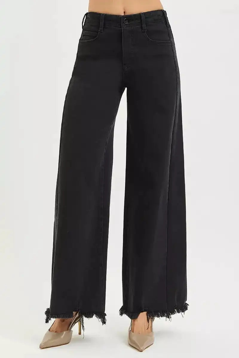 RISEN Tummy Control High Rise Palazzo Leg Frayed Hem Jeans