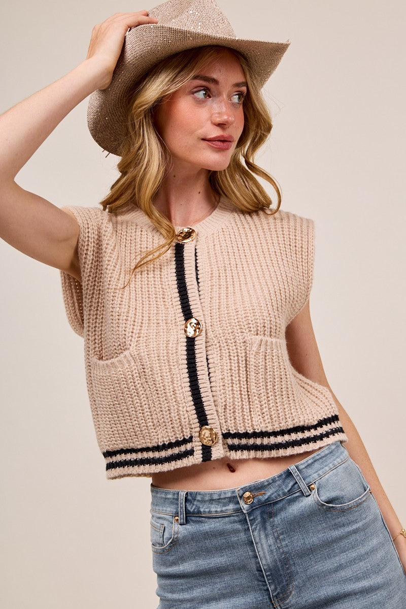 The Big Metal Button Front Stripe Edge Knitted Sweater Vest is a stylish and versatile addition to any wardrobe. Featuring a unique design with metal button details and striped edges, this vest combines comfort and fashion effortlessly. Perfect for layering over shirts or blouses, it can be dressed up or down for various occasions. The high-quality knit material ensures both warmth and durability, making it a practical choice for the cooler seasons. Stand out with this trendy sweater vest that adds a touch of sophistication to your outfit.