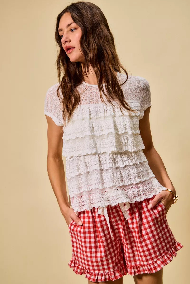 SO ME Ruffle Tiered Stretch Lace Short Sleeves Knit Top - Sleekdenim.com