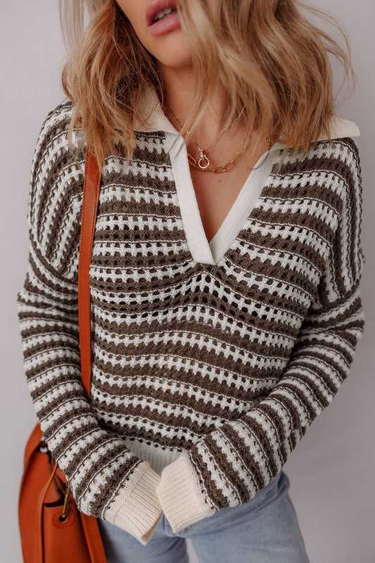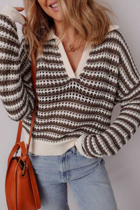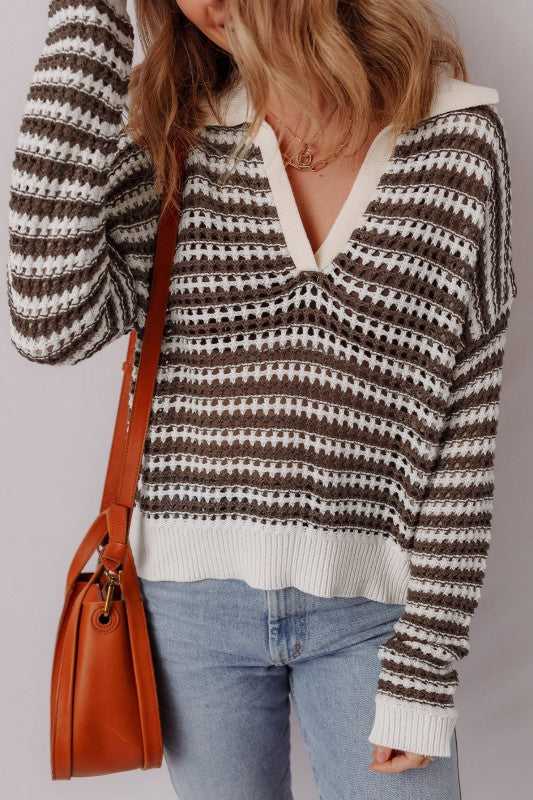 Stripe Eyelet Contrast Collared V-Neck Sweater