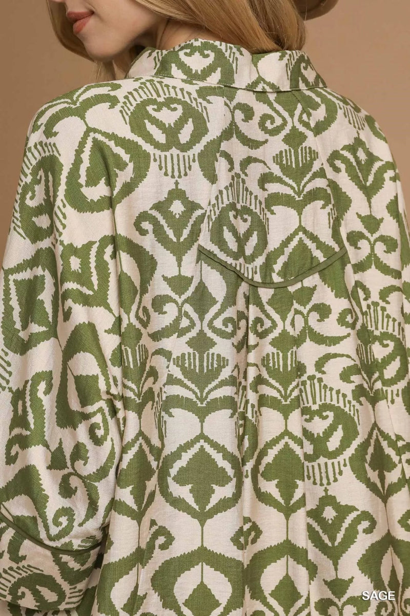 The Abstract Print Button-Up Oversized Shirt features a relaxed silhouette that offers a comfortable and stylish fit. With elbow-length sleeves...