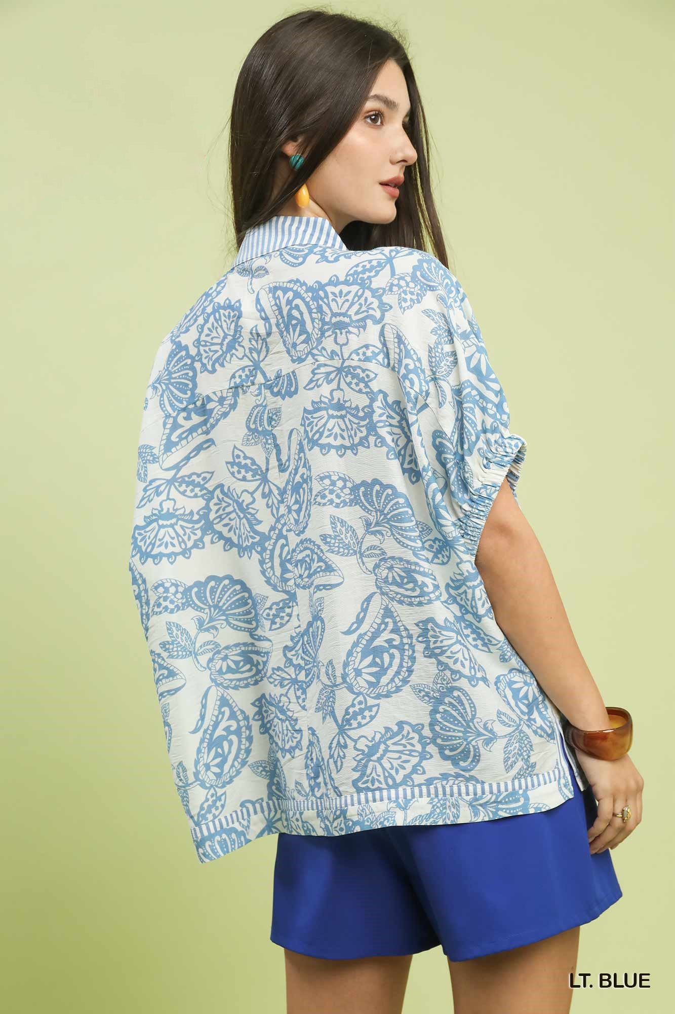 Umgee Botanical Print Mixed Trim Tunic Top
